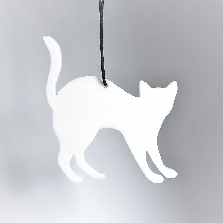Ornament med enkelt og stilrent udtryk, der er ideél til den moderne bolig. En sød heksekat skaber den helt rigtige stemning til Halloween, Skt Hans eller Fastelavn. Er smuk i vinduet, på en gren, om en lysestage, kun fantasien sætter grænser. Fås i farven hvid og sort.