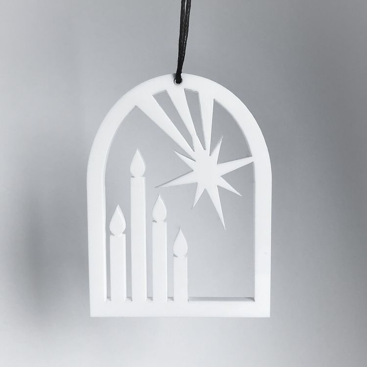 Ornament med enkelt og stilrent udtryk, der er ideél til den moderne julebolig. Ornamentet er udformet som et smukt julevindue pyntet til advent. Er smuk på juletræet, i vinduet, en gren, om en lysestage, kun fantasien sætter grænser. Fås i farven hvid.