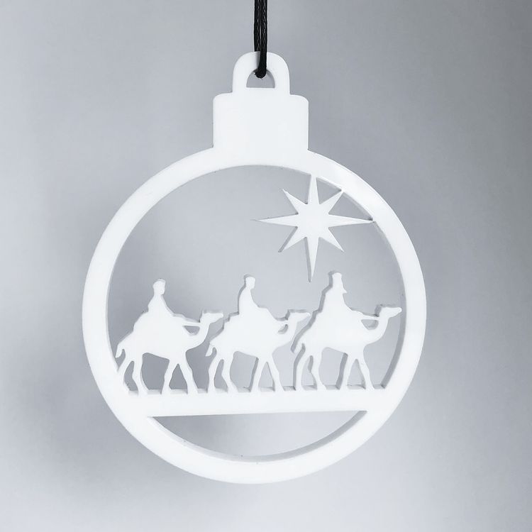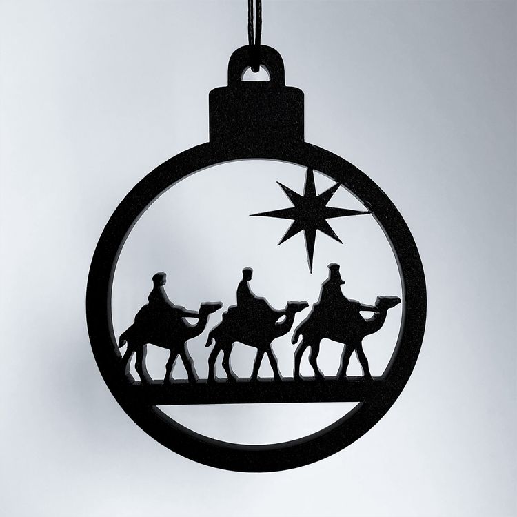 Ornament med enkelt og stilrent udtryk, der er ideél til den moderne jul. Ornamentet er formet som en klassisk julekugle med de tre vise mænd. Er smuk på juletræet, i vinduet, på en gren, om en lysestage, kun fantasien sætter grænser.