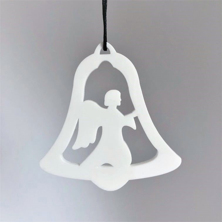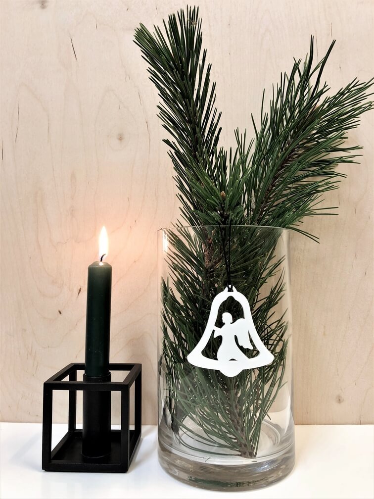 Ornament med enkelt og stilrent udtryk, der er ideél til den moderne jul. Ornamentet er formet som en klassisk juleklokke med en lille engel og er smuk på juletræet, i vinduet, en gren, om en lysestage, kun fantasien sætter grænser. Fås i farven hvid.