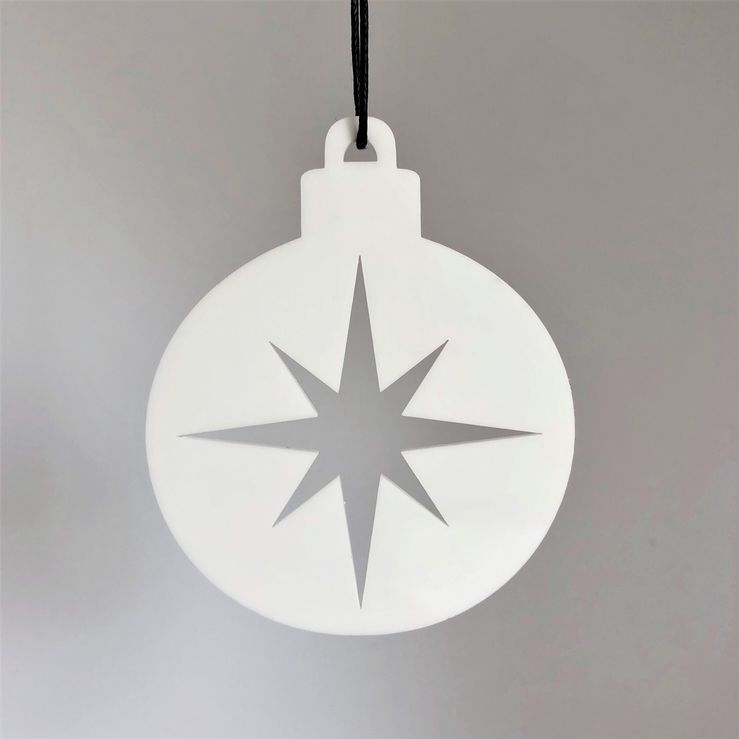 Ornament med enkelt og stilrent udtryk, der er ideél til den moderne jul. Ornamentet er formet som en klassisk julekugle med en smuk julestjerne. Er smuk på juletræet, i vinduet, en gren, om en lysestage, kun fantasien sætter grænser. Fås i farven hvid og sort.