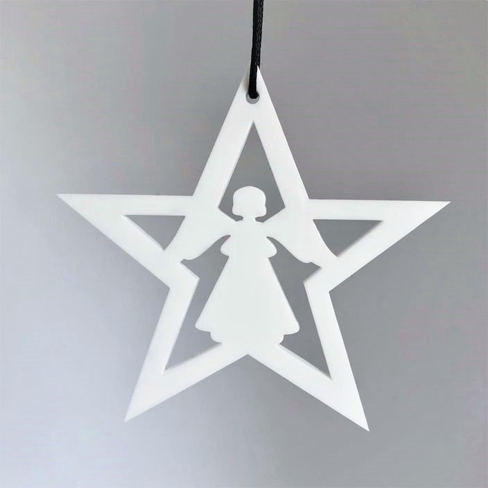 Ornament med enkelt og stilrent udtryk, der er ideél til den moderne jul. Ornamentet er formet som en klassisk julestjerne med en lille engel. Er smuk på juletræet, i vinduet, en gren, om en lysestage, kun fantasien sætter grænser. Fås i farven hvid og klar.