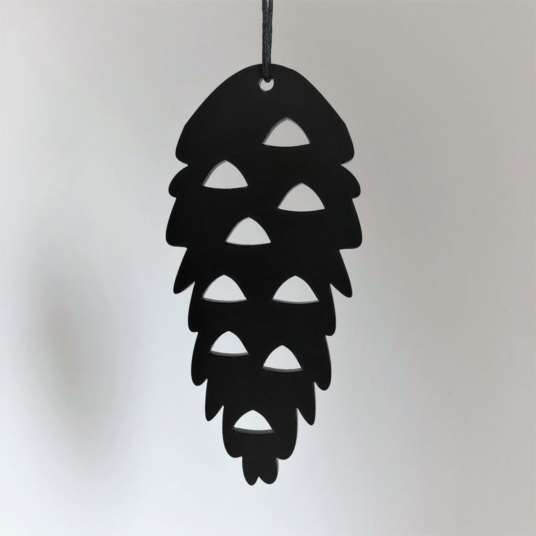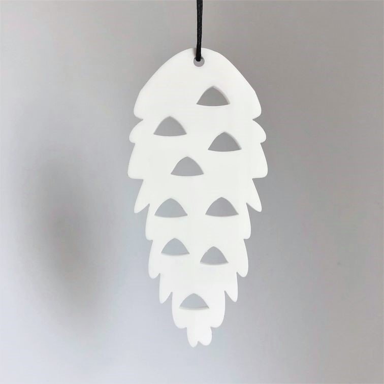 Ornament med enkelt og stilrent udtryk, der er ideél til den moderne jul. Ornamentet er udformet som en stor grankogle. Er smuk på juletræet, i vinduet, en gren, om en lysestage, kun fantasien sætter grænser. Fås i farven hvid og sort.