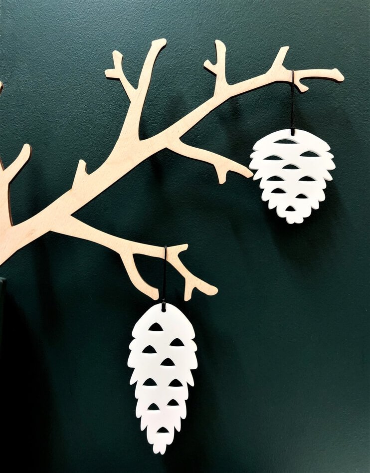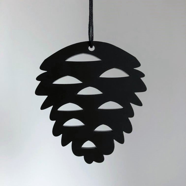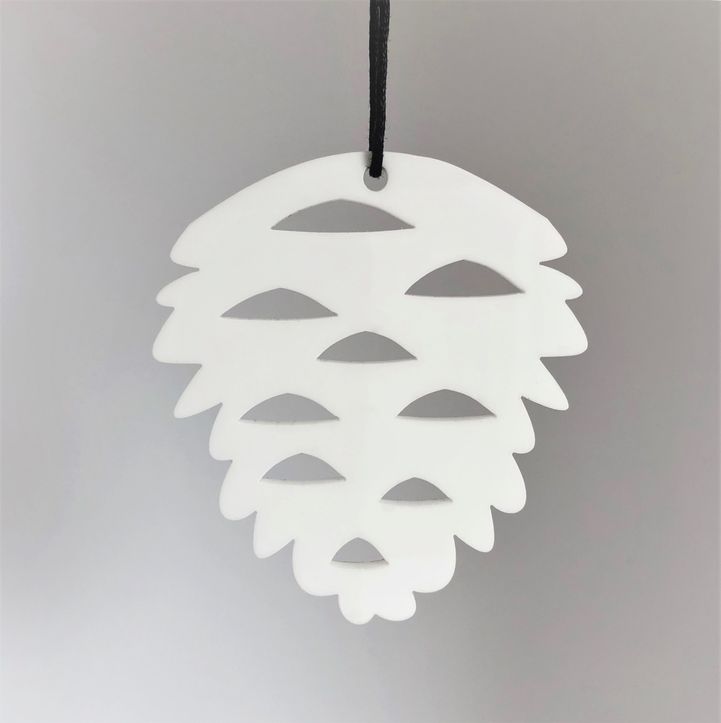 Ornament med enkelt og stilrent udtryk, der er ideél til den moderne jul. Ornamentet er udformet som en lille grankogle. Er smuk på juletræet, i vinduet, en gren, om en lysestage, kun fantasien sætter grænser. Fås i farven hvid og sort.