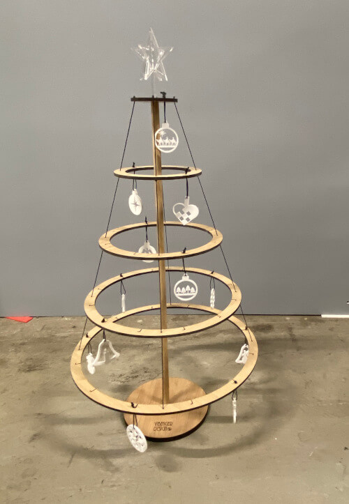 Juletræet består af en fod, en bærende stamme, 5 ringe med L huller til ophæng og en 3D stjerne i toppen.