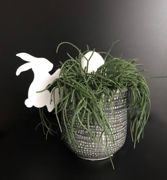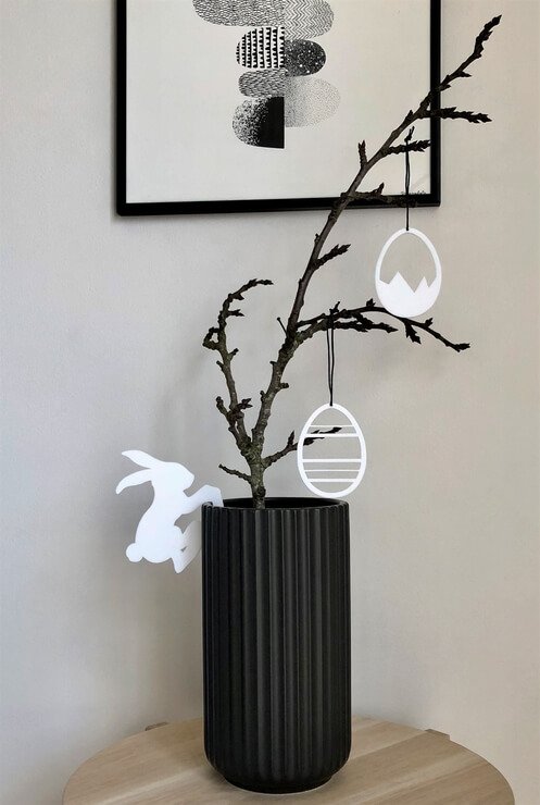 Moderne påskehare i et enkelt og stilrent udtryk. Klassisk påskepynt som vi alle kender, men med en moderne streg og materiale. Påskeharen kan bruges i bl.a. Lyngby eller Kähler vaser, urtepotter e.l.