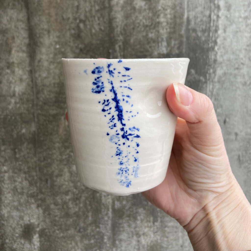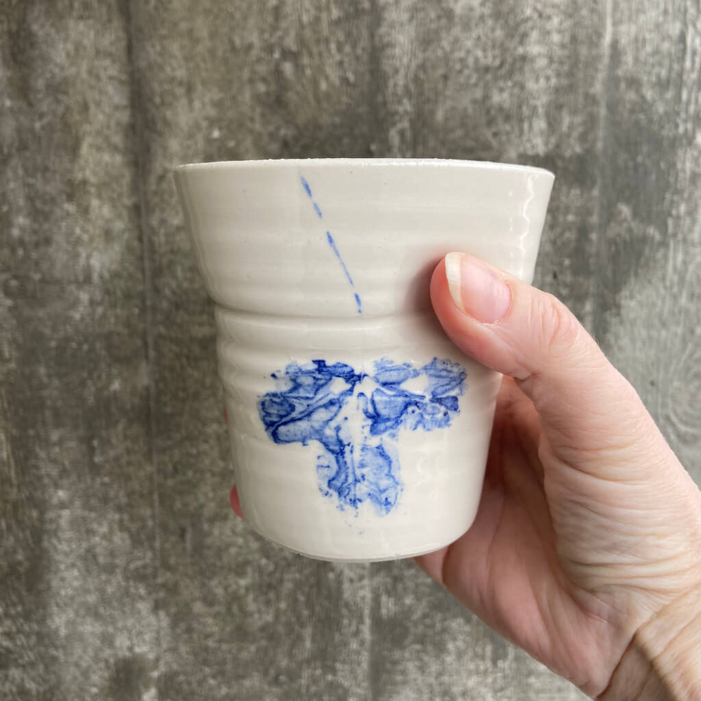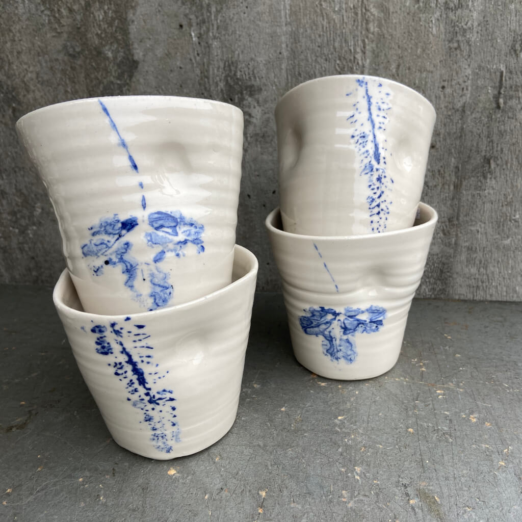 Alle krus har et blåt aftryk af et blad og gennemsigtig glasur.