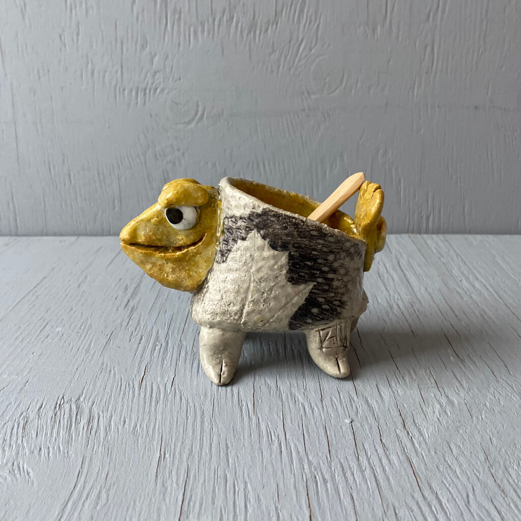 Dette saltkar har en blank gul/orange glasur, mat grå blad tryk, et smil og fine sort hvide øjne.