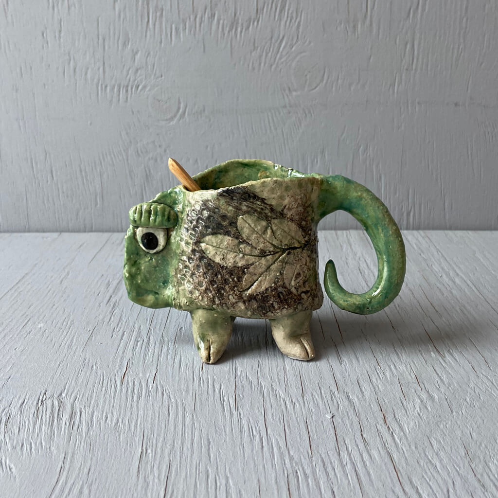 Dette saltkar har en blank grønblå glasur, gråt blad tryk, en hale og de fine sort hvide øjne.