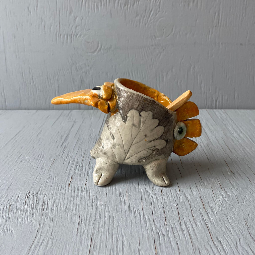 Dette saltkar har en blank orange glasur, mat grå blad tryk og øjne der kigger på stjerner.