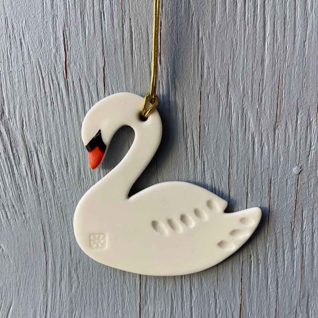 Svane ornament i keramik smukt ophæng på en gren eller i et vindue.