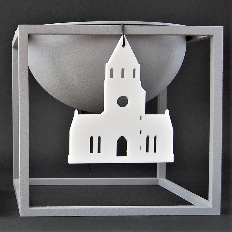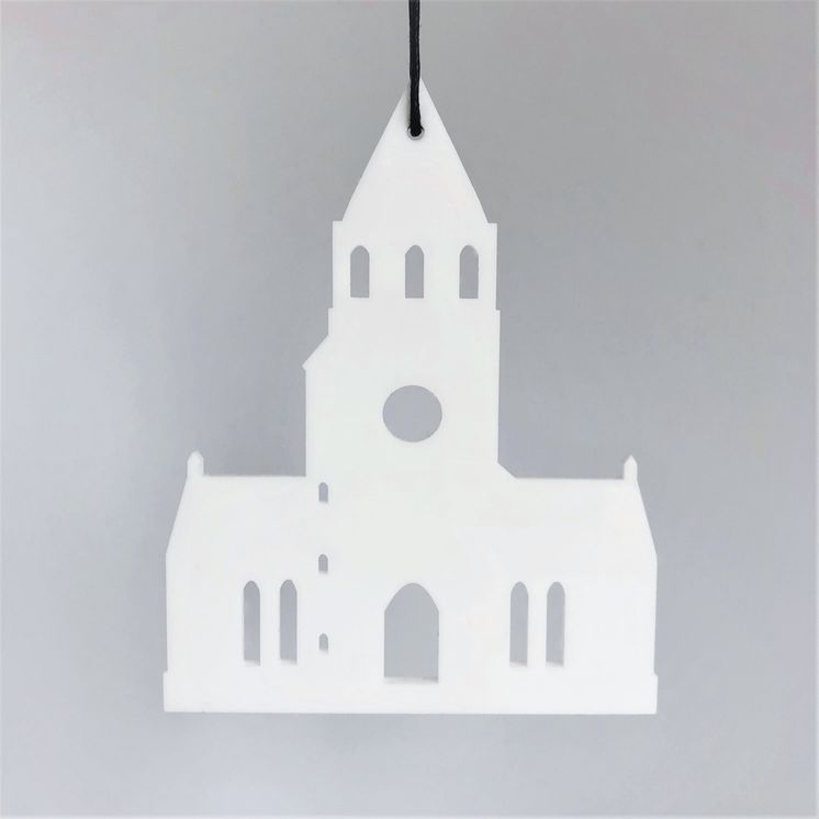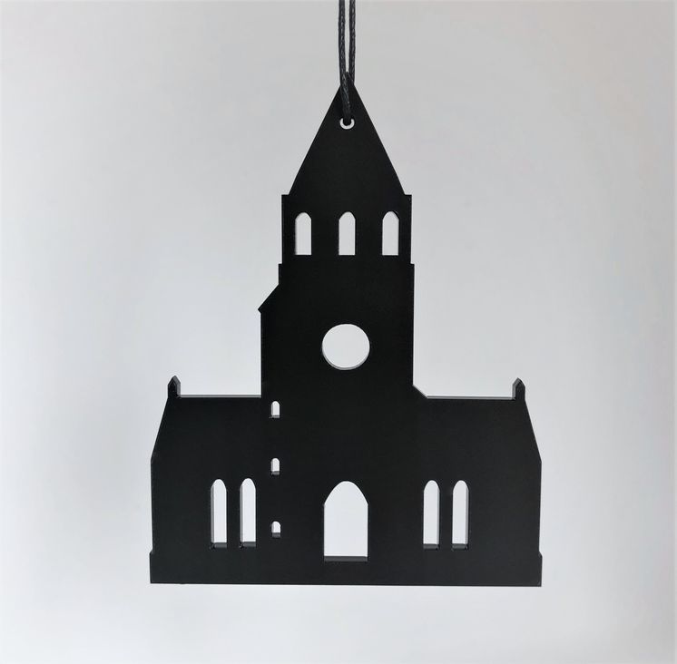 Enkelt og stilrent ornament, der er ideél i den moderne indretning. Ornamentet afspejler Tyrstrup kirke ved Christiansfeld. Oplagt til vinduesophæng, på juletræet, en gren, om en lysestage, kun fantasien sætter grænser. Fås i farven hvid og sort.