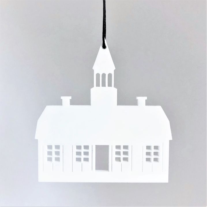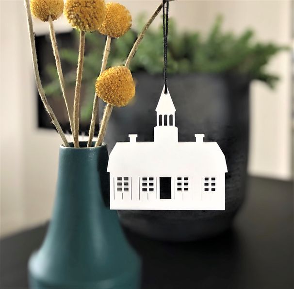 Enkelt og stilrent ornament, der er ideél i den moderne indretning. Ornamentet afspejler det smukke rådhus i Ebeltoft. Oplagt til vinduesophæng, på juletræet, en gren, om en lysestage, kun fantasien sætter grænser. Fås i farven hvid og sort.