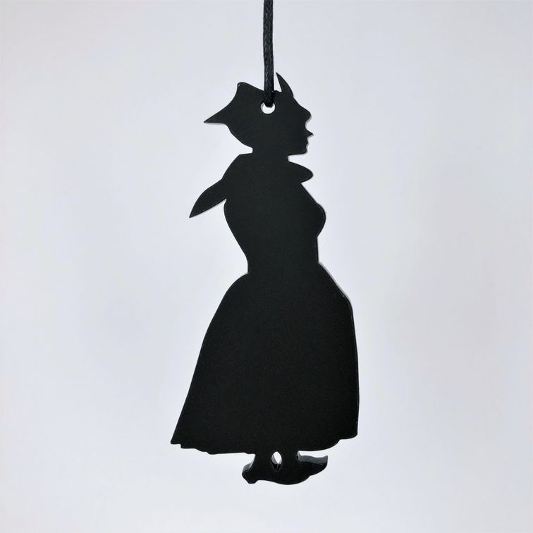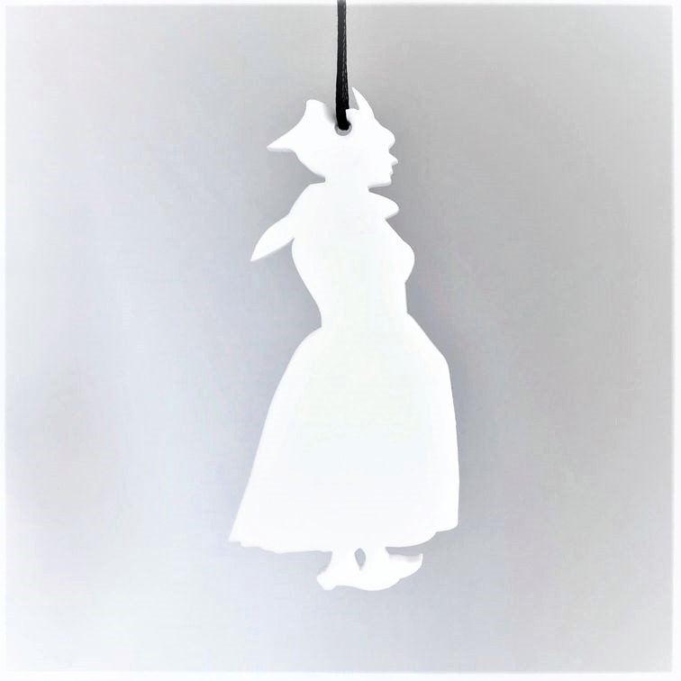 Enkelt og stilrent ornament, der er ideél i den moderne indretning. Ornamentet afspejler en Fanø pige i klassisk beklædning. Oplagt til vinduesophæng, på juletræet, en gren, om en lysestage, kun fantasien sætter grænser. Fås i farven hvid og sort.