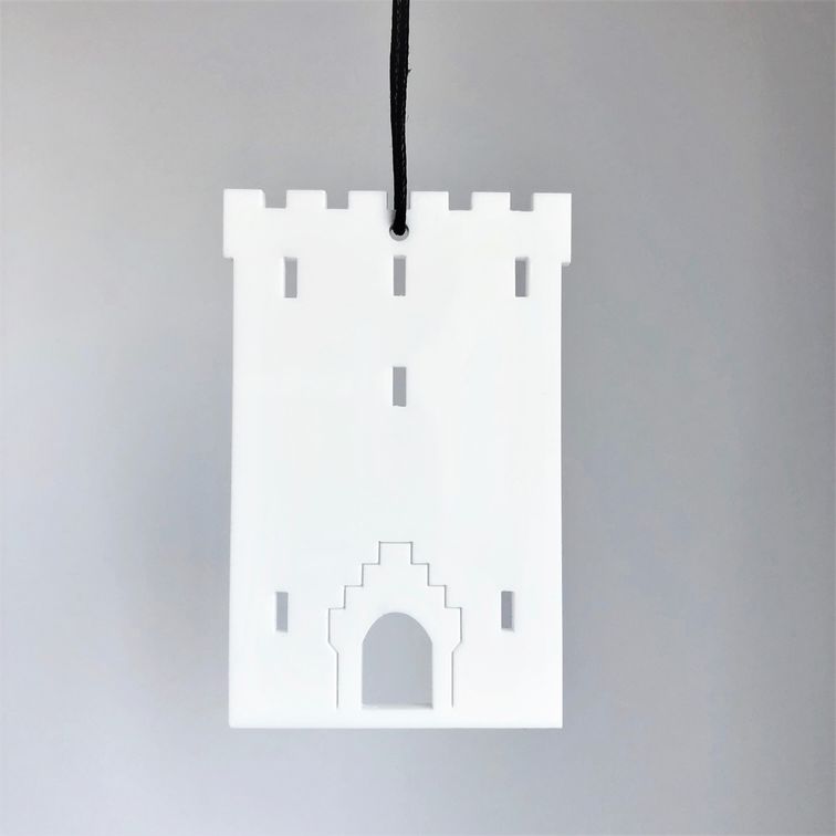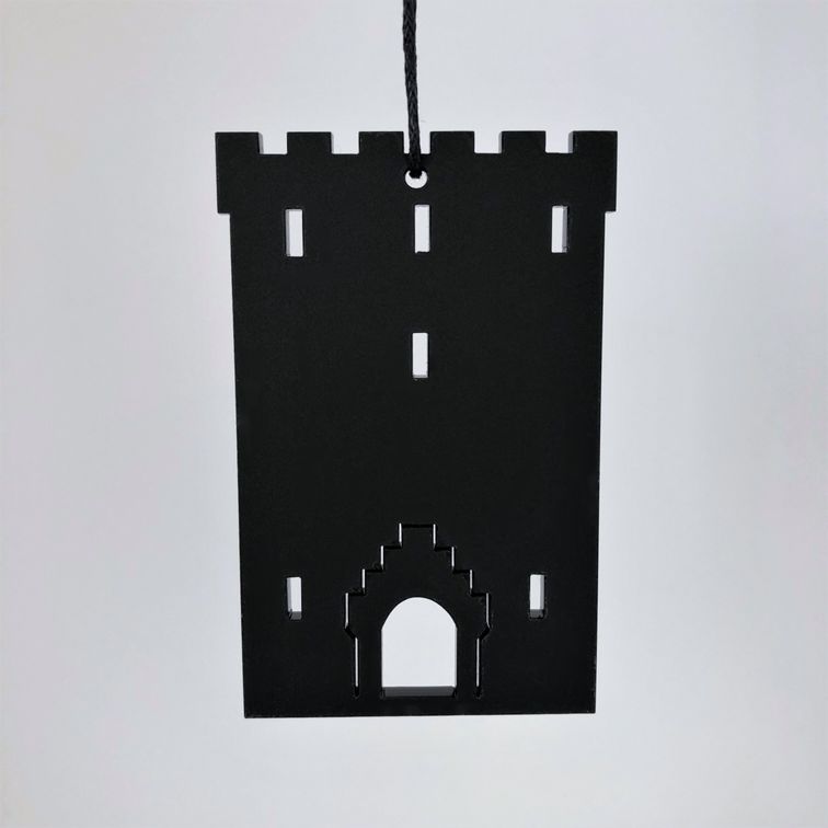 Enkelt og stilrent ornament, der er ideél i den moderne indretning. Ornamentet afspejler Vandtårnet på volden i Fredericia. Oplagt til vinduesophæng, på juletræet, en gren, om en lysestage, kun fantasien sætter grænser. Fås i farven hvid og sort.