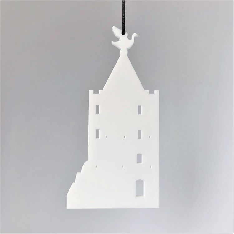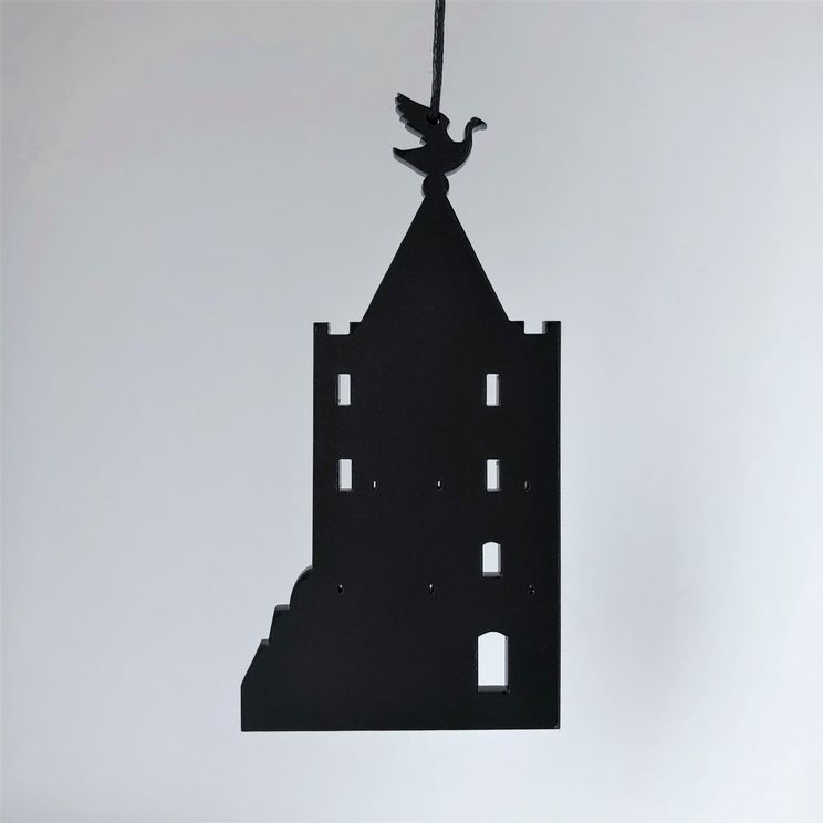 Enkelt og stilrent ornament, der er ideél i den moderne indretning. Ornamentet afspejler det smukke Gåsetårn i Vordingborg. Oplagt til vinduesophæng, på juletræet, en gren, om en lysestage, kun fantasien sætter grænser. Fås i farven hvid og sort.