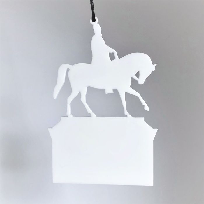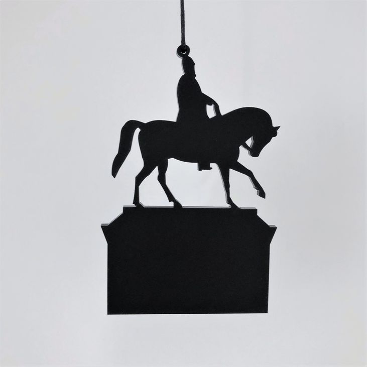 Enkelt og stilrent ornament, der er ideél i den moderne indretning. Ornamentet afspejler Rytterstatuen af Frederik d. 5. Oplagt til vinduesophæng, på juletræet, en gren, om en lysestage, kun fantasien sætter grænser. Fås i farven hvid og sort.
