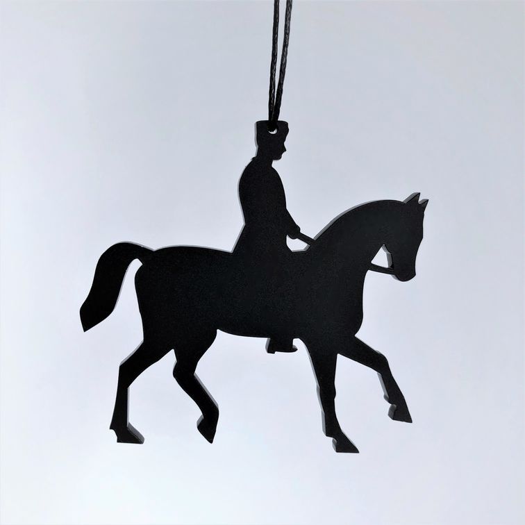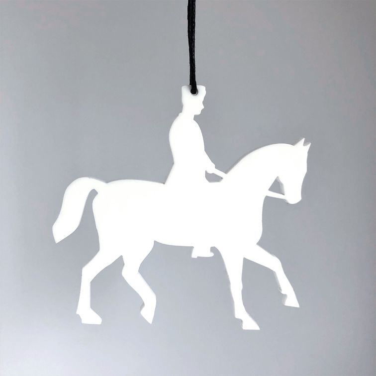 Enkelt og stilrent ornament, der er ideél i den moderne indretning. Ornamentet afspejler Kong Cristian d. 10. til hest. Oplagt til vinduesophæng, på juletræet, en gren, om en lysestage, kun fantasien sætter grænser. Fås i farven hvid og sort.